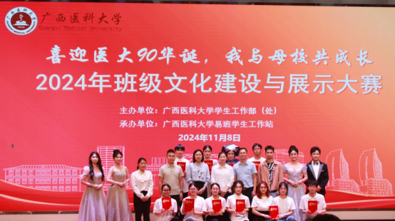 11月8日晚上,广西医科大学2024年班级文化建设与展示大赛决赛在武鸣校区图书馆一楼报告厅顺利举行。学工部(处)、各学院学工办老师与2023级晋级决赛的各班代表,2024级班委代表及校易班学生骨干们400余人观看了比赛。