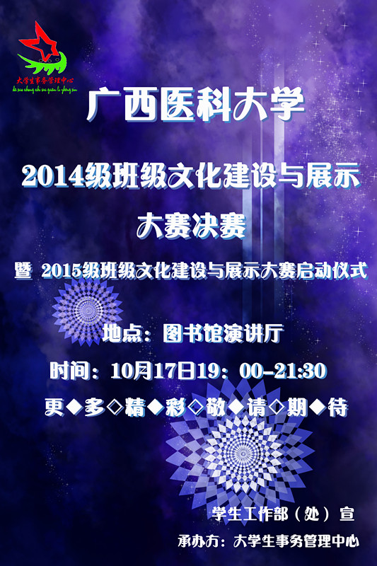 我的班级我做主,这是属于青春的舞台,精彩即将上演,各类奖项最终花落谁家,我们拭目以待!10月17日19:00—21:30,图书馆演讲厅,2014级班级文化建设与展示大赛决赛暨2015级班级文化建设与展示大赛启动仪式,与您不见不散!