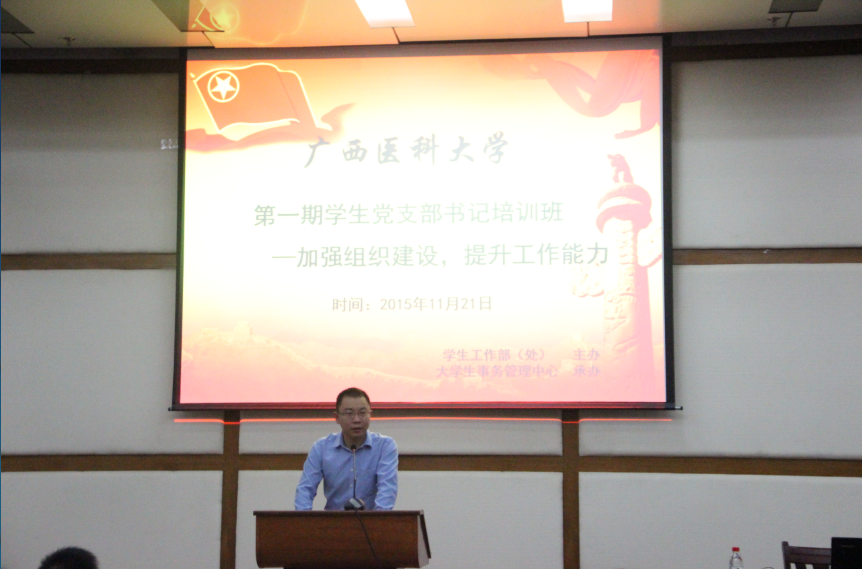 2015年11月21日、22日,由校学工部(处)主办、大学生事务管理中心承办的广西医科大学2015年学生党支部书记培训班顺利举行,此次培训以“加强组织建设,提升工作能力”为主题,分为理论授课、讨论学习和实践活动三个环节。全校本、专科全体学生党支部正、副书记参加此次培训。