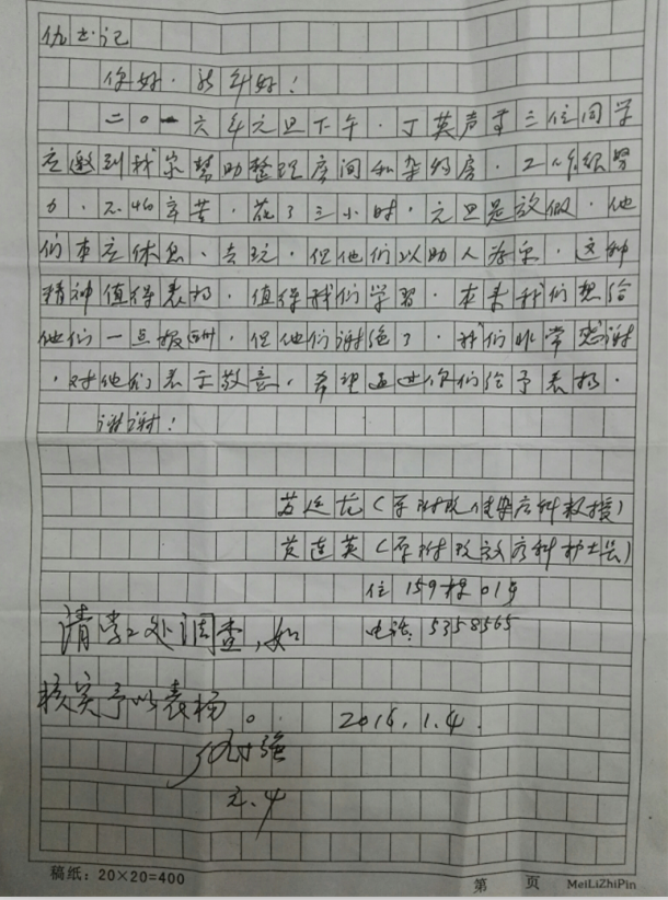 2016年1月1日下午,我校人文社会科学学院2014级36班丁英声、李伟、朱恩宏3名学生应邀到第一附属医院退休职工苏教授和黄护士长家中帮忙整理房间及杂物房。三个多小时里他们埋头苦干,不怕辛苦,完成工作并谢绝了苏教授的酬谢。苏教授被他们的精神所感动,写感谢信表扬他们“不怕辛苦,助人为乐”的优秀品质。
