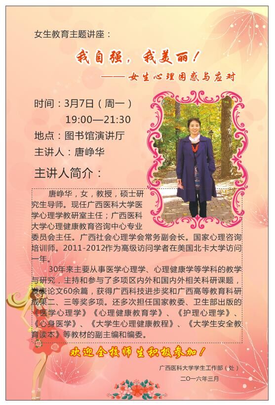 “我自强,我美丽——女生心理困扰及应对”专题讲座预告