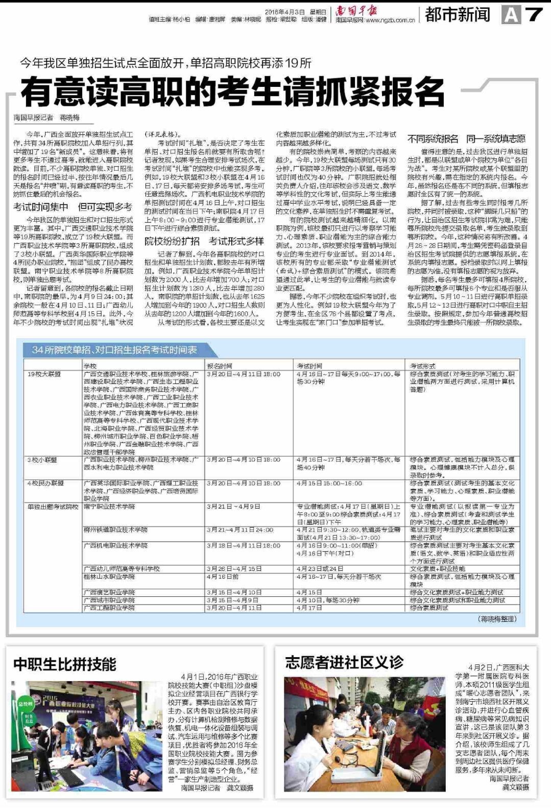 为弘扬雷锋精神,普及志愿服务理念,促进我校学生在社会实践中得到全面发展,4月2日,第一临床医学院七年制2011级3班同学在琅西社区开展了“春暖人心,情系社区”志愿服务活动。《南国早报》进行了题为《志愿者进社区义诊》的报道。以下是页面截图: