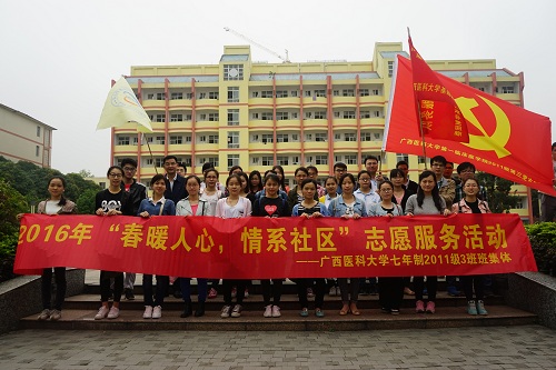 据悉,第一临床医学院七年制2011级3班始终坚持“团结友爱、服务奉献”的理念,于2013年在班级导师的带领下,创建了“暖心”志愿服务队。三年来,先后服务了埌西社区、大阪社区、津头社区、马山县古寨瑶族乡古今村等,获得了南宁《生活报》、《南宁晚报》和“青秀区政务信息网”等媒体的报道。