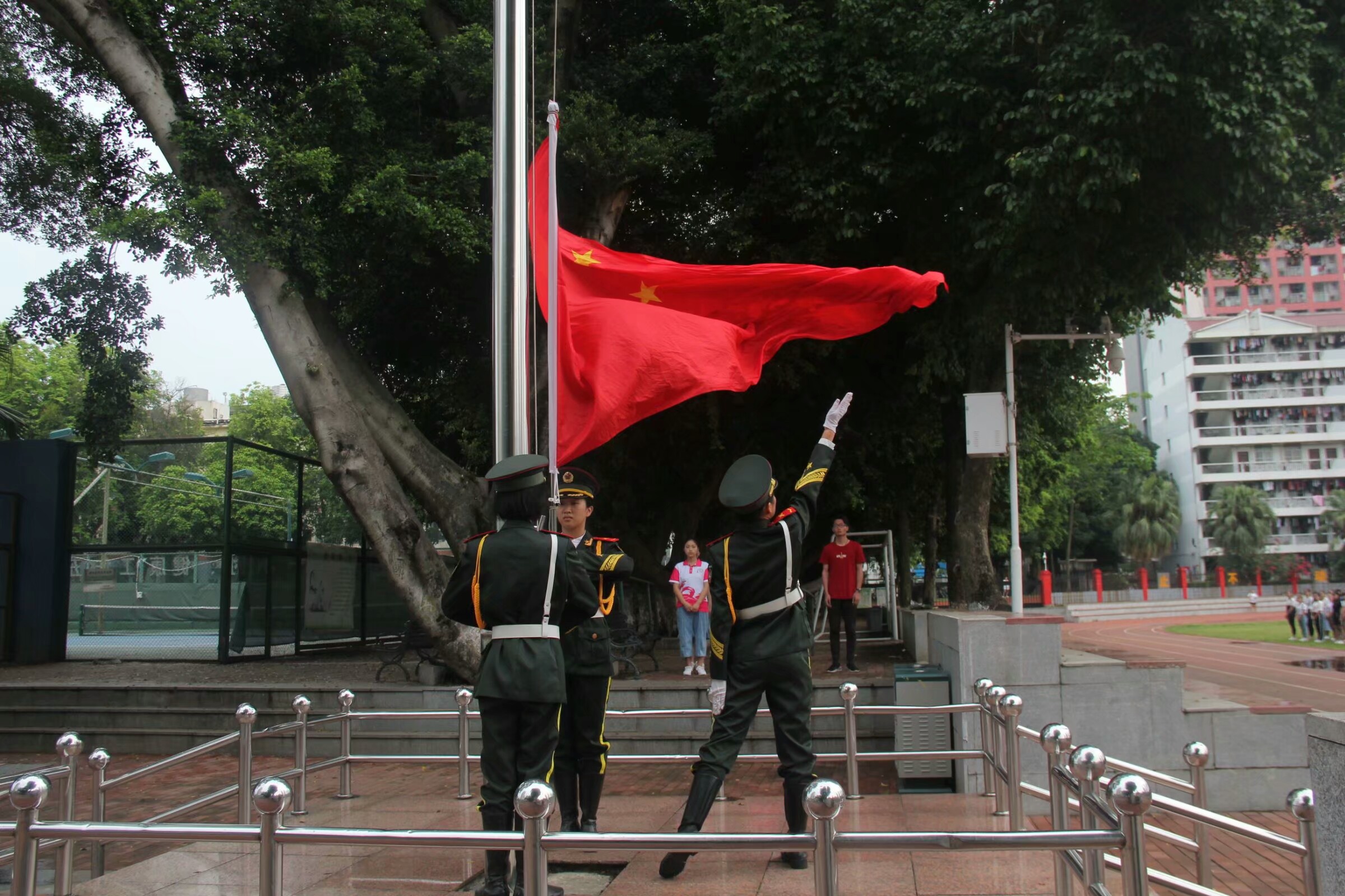 10月1日八点整,迎着晨曦,校国旗护卫队在足球场举行了庄严肃穆的升旗仪式,伴随着雄壮激昂的国歌,鲜艳的五星红旗冉冉升起在学校上空,红旗飘扬,蓝天无垠,风景无限,过往师生无不停下脚步,注视着鲜红的国旗,唱着响亮的国歌,爱国之情油然而生。与此同时,由第一临床医学院承办的易班线上活动正如火如荼的举行着。来自不同班级、党支部、实习组的同学们,组成不同的队伍,以校园各个角落为背景,将对祖国的祝福化作句句歌词,将拳拳爱国之心化作激扬的歌声,《歌唱祖国》、《中国人》、《红旗飘飘》、《国家》等耳熟能详的歌曲洒满了整个广西医科大学,也激起了全校师生对祖国母亲深深的祝福与热爱。活动将持续到10月8日,在易班上进行视频展播与投票,以吸引更多的师生参与到对祖国的祝福中。