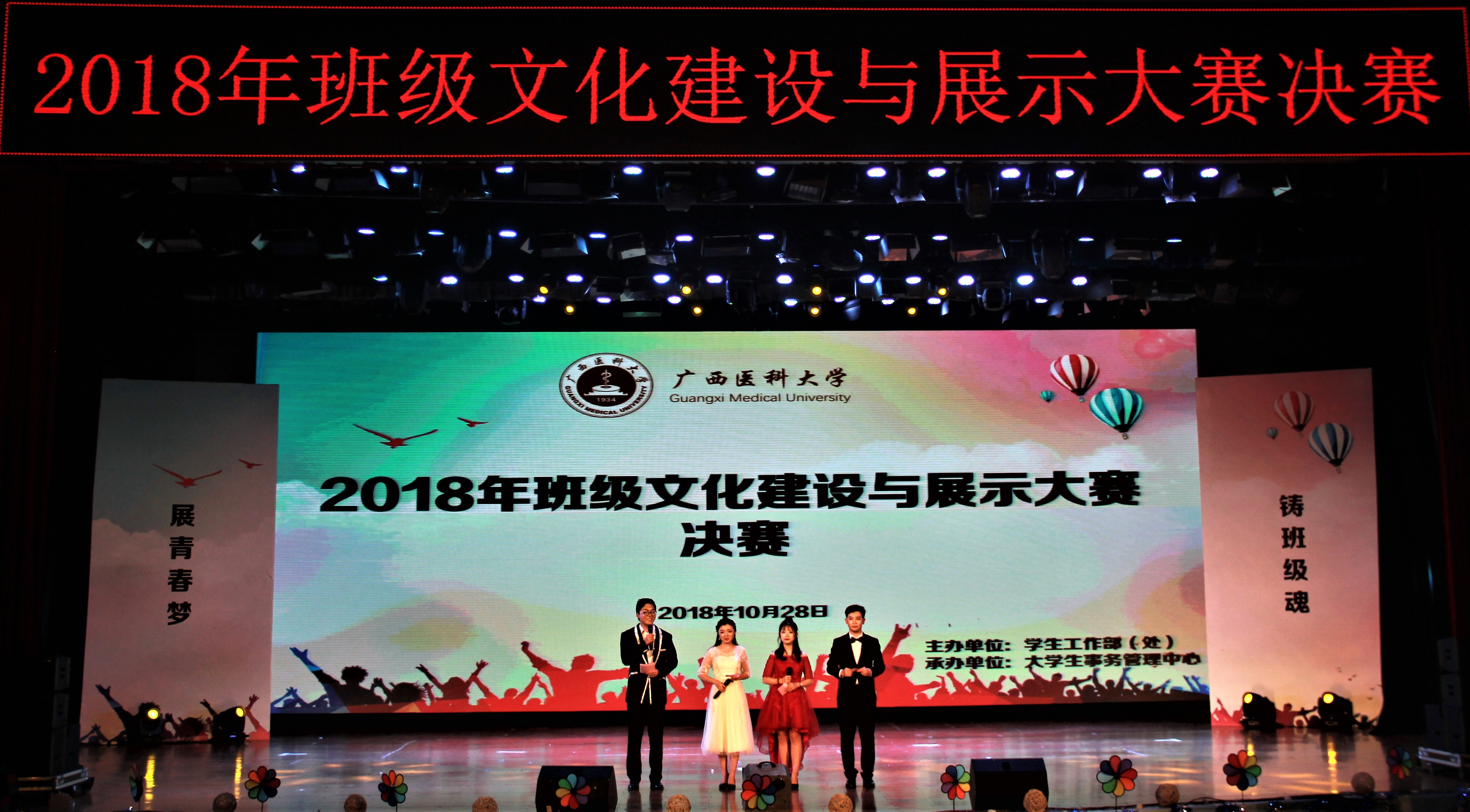 10月28日晚,广西医科大学2018年班级文化建设与展示大赛决赛在图书馆演讲厅隆重举行,我校学生工作部(处)部(处)领导、各学院分管学生工作领导、辅导员、班主任,校内外学生组织及学生代表等900余人观看了比赛。比赛邀请广西艺术学院学生工作部(处)副部(处)长冯绍君、广西中医药大学易班发展中心办公室副主任熊小丽出席并担任评委。