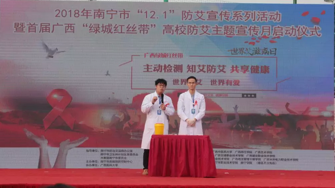 据悉,2018年广西“绿城红丝带”高校防艾主题宣传月活动由高校篮球联赛、防艾主题辩论赛、防艾作品大赛、防艾宣讲进校园、防艾行动进校园等部分构成,整个活动的开展将历时近一个月。我校协同南宁市疾病控制中心开展此次活动,旨在向高校青年学生宣传艾滋病预防知识,使更多的青年学生正视艾滋病,了解艾滋病的传播途径、发病机理和症状,以更好地遏制艾滋病的传播和蔓延,消除人们对艾滋病毒感染者和患者的歧视和偏见,营造良好的社会和生活环境,推动全社会力量共同参与艾滋病防治工作。