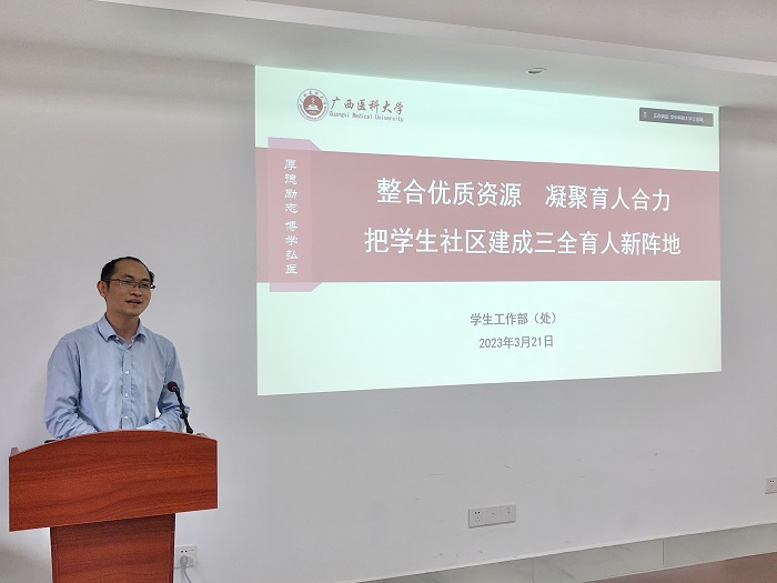 交流会上,闵晓阳部长对广西中医药大学学工部叶勇玲部长一行的到来表示热烈欢迎。廖剑副部长对我校一站式学生社区建设基本情况、建设任务与方案、社区模式举措与成效及下一步计划进行了汇报,各位老师就学生社区建设相关问题进行了深入交流。