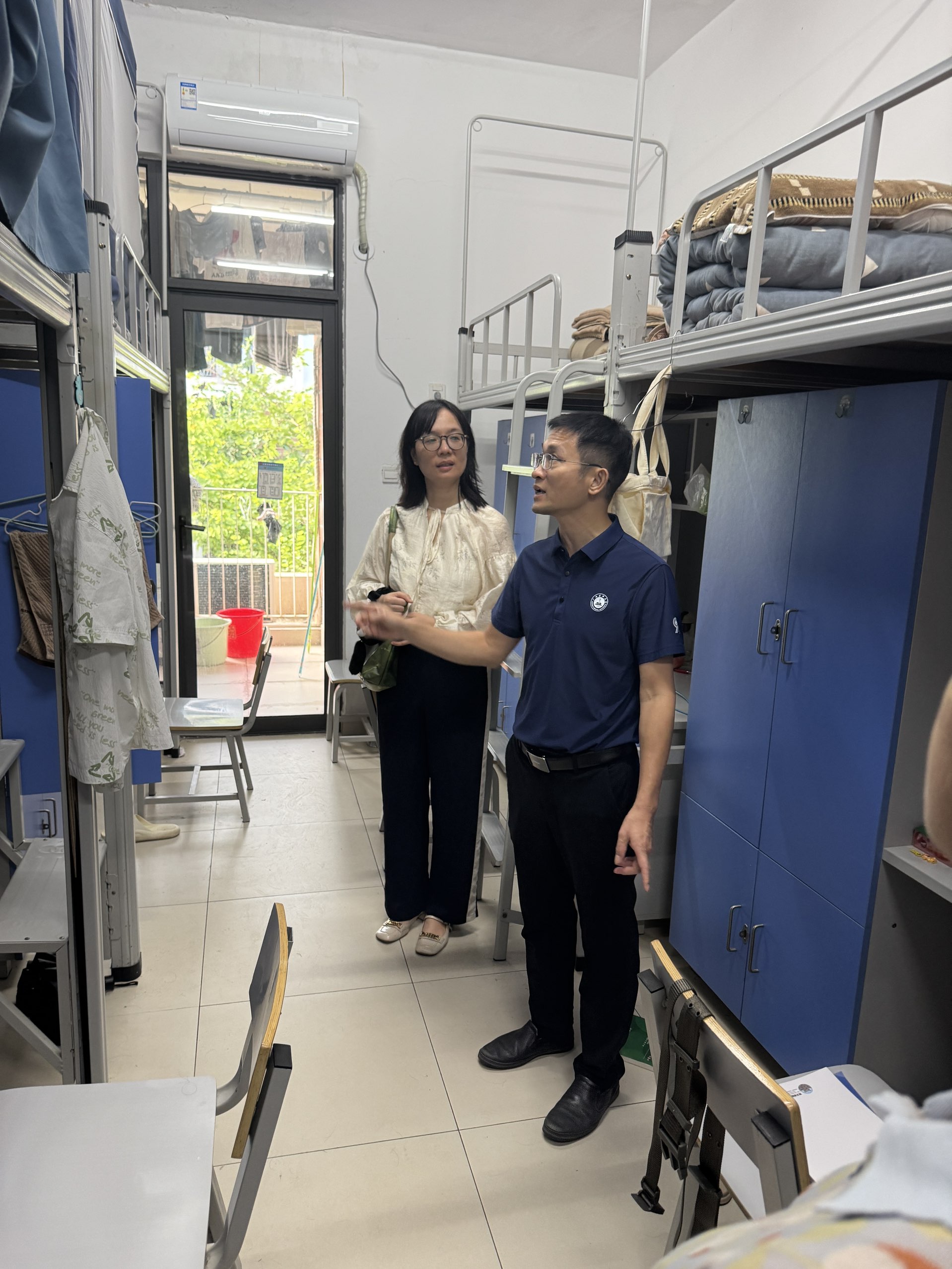 本次检查由学生工作处长覃雄带队,学生工作处、后勤基建处、保卫处相关老师及各二级学院辅导员共同参与。检查组采取随机抽查的方式,覆盖校本部A、B、E栋、12栋、红楼女1、4栋以及武鸣校区所有楼栋,重点围绕宿舍内务整理与消防安全隐患展开,特别是武鸣校区新生宿舍的蚊帐床帘收整情况、使用或存放大功率电器等行为。