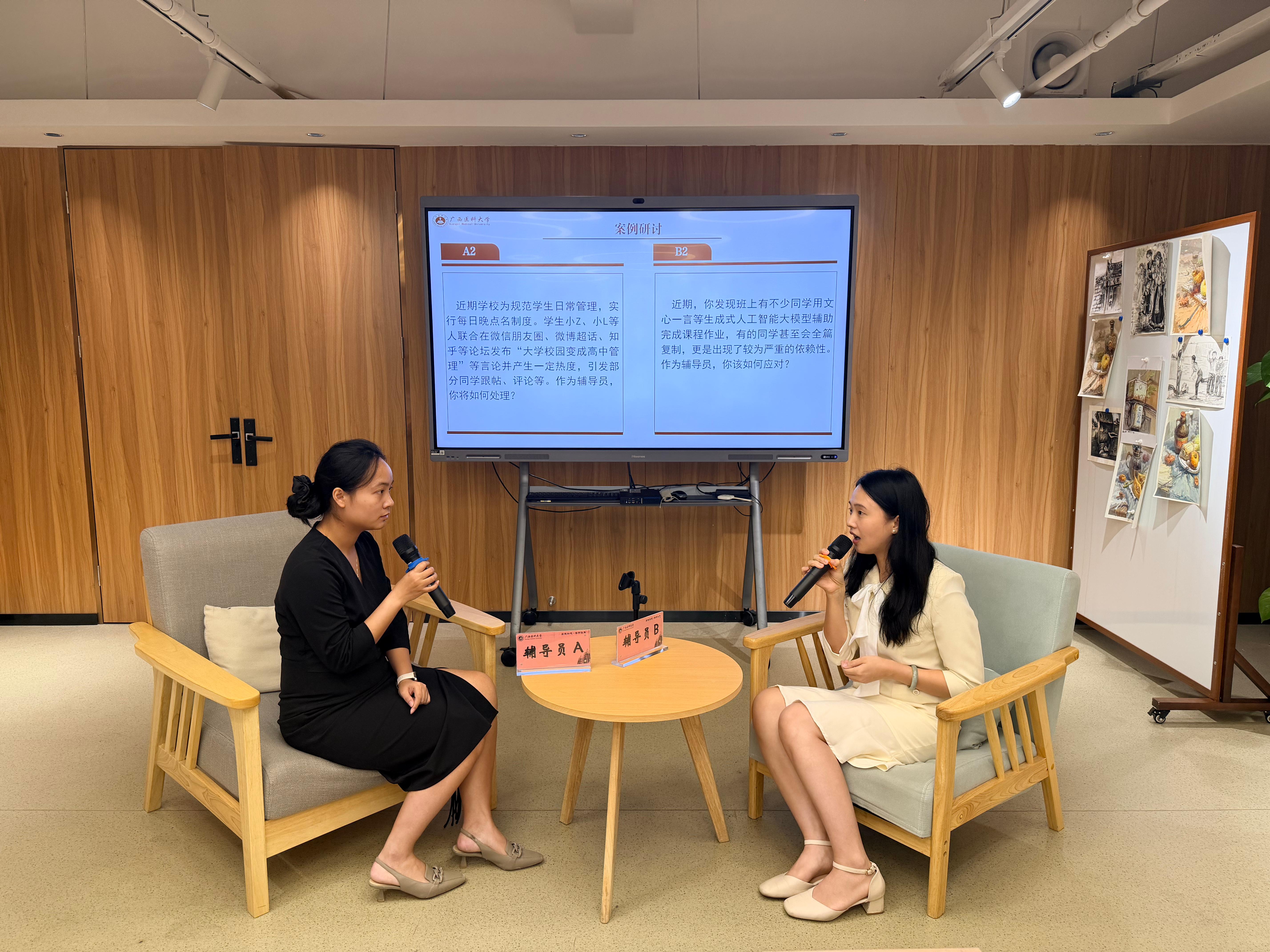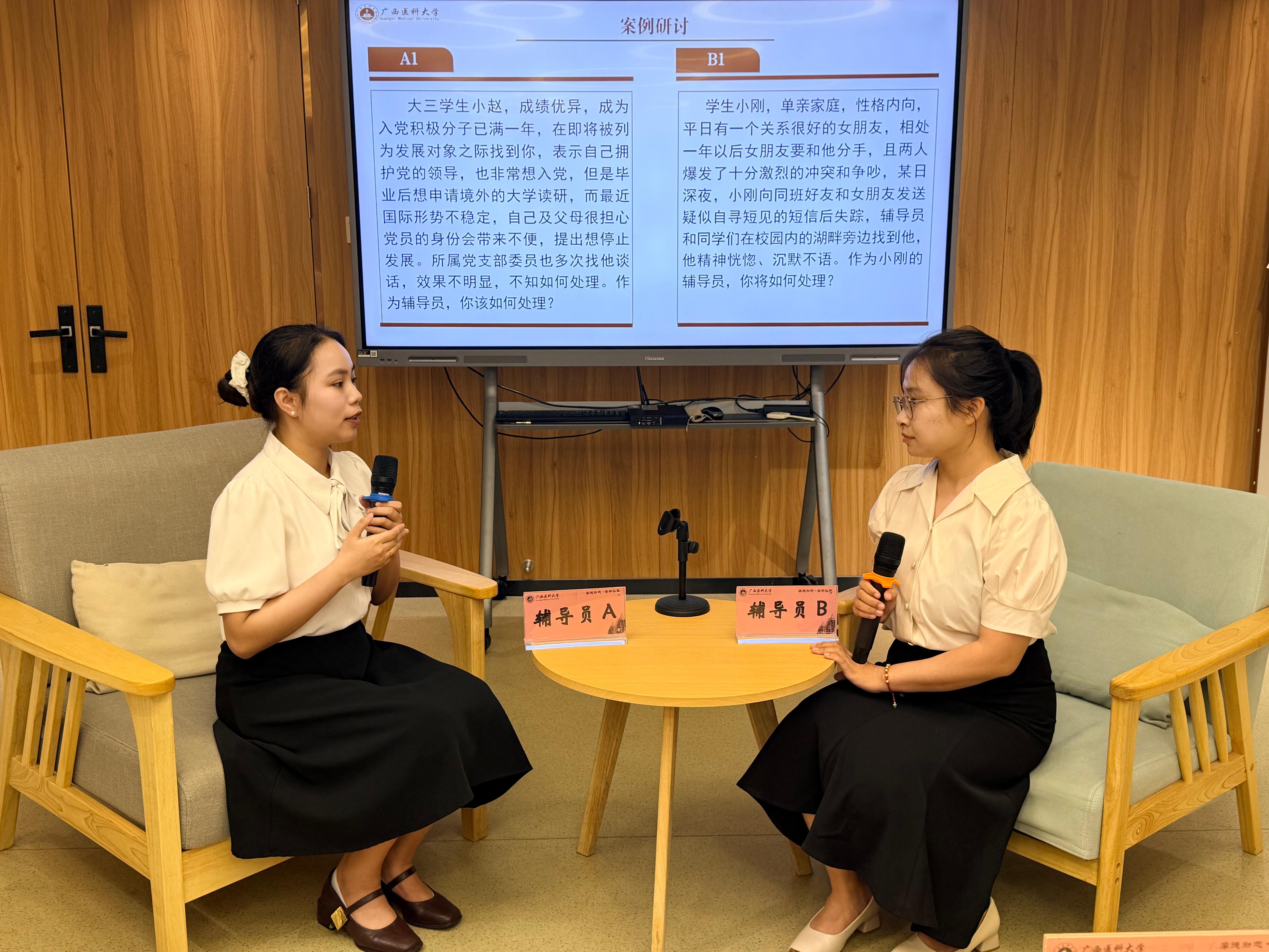 训练营以“以赛促学 以学促行”为主题,紧扣辅导员素质能力大赛的“案例研讨”与“谈心谈话”两大核心实战模块,联动兄弟院校开展磨赛行动。活动分别邀请到第十二届广西高校辅导员素质能力大赛特等奖和一等奖获得者,来自广西民族大学的农植媚、徐辉丽两位辅导员,以及我校2个自治区高水平辅导员工作室的主持人,人文社会科学学院副书记郑茸和基础医学院学办主任罗长钦,作为训练营的分享及督导专家。来自广西医科大学、广西民族大学、广西交通职业技术学院6名即将参加区赛的辅导员依次进行了“案例研讨”和“谈心谈话”环节的演练。案例研讨环节围绕学生情感危机引发极端倾向、优秀学生因出国顾虑申请停止入党发展、学生依赖生成式AI完成作业、学生因晚点名制度在网络发表负面言论等4个主题进行实战演练。4位专家从“破题逻辑、处理步骤、育人维度”三个层面展开指导,并结合区赛经验,讲授了如何快速梳理思路、增加分析亮点,融入育人理念等实用技巧,帮助辅导员掌握案例分析核心方法。谈心谈话环节立足学生成长困境设置了学生因陷入校园贷致成绩下滑、心理崩溃,以及因沉迷网络直播影响宿舍秩序与学业进度两个情景,进行现场模拟。督导专家对辅导员的表现进行了及时反馈,提出兼具实效和专业的建议。