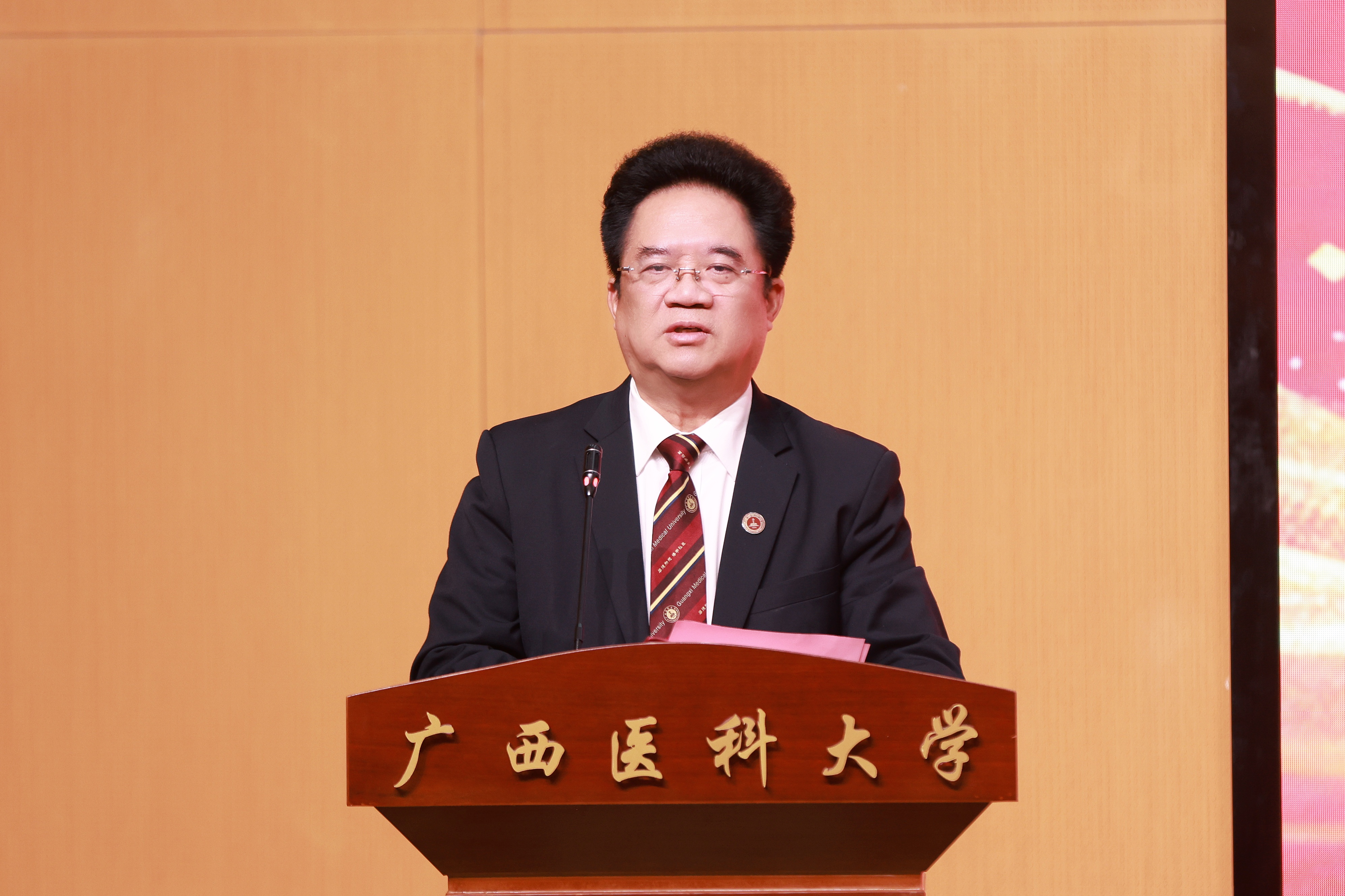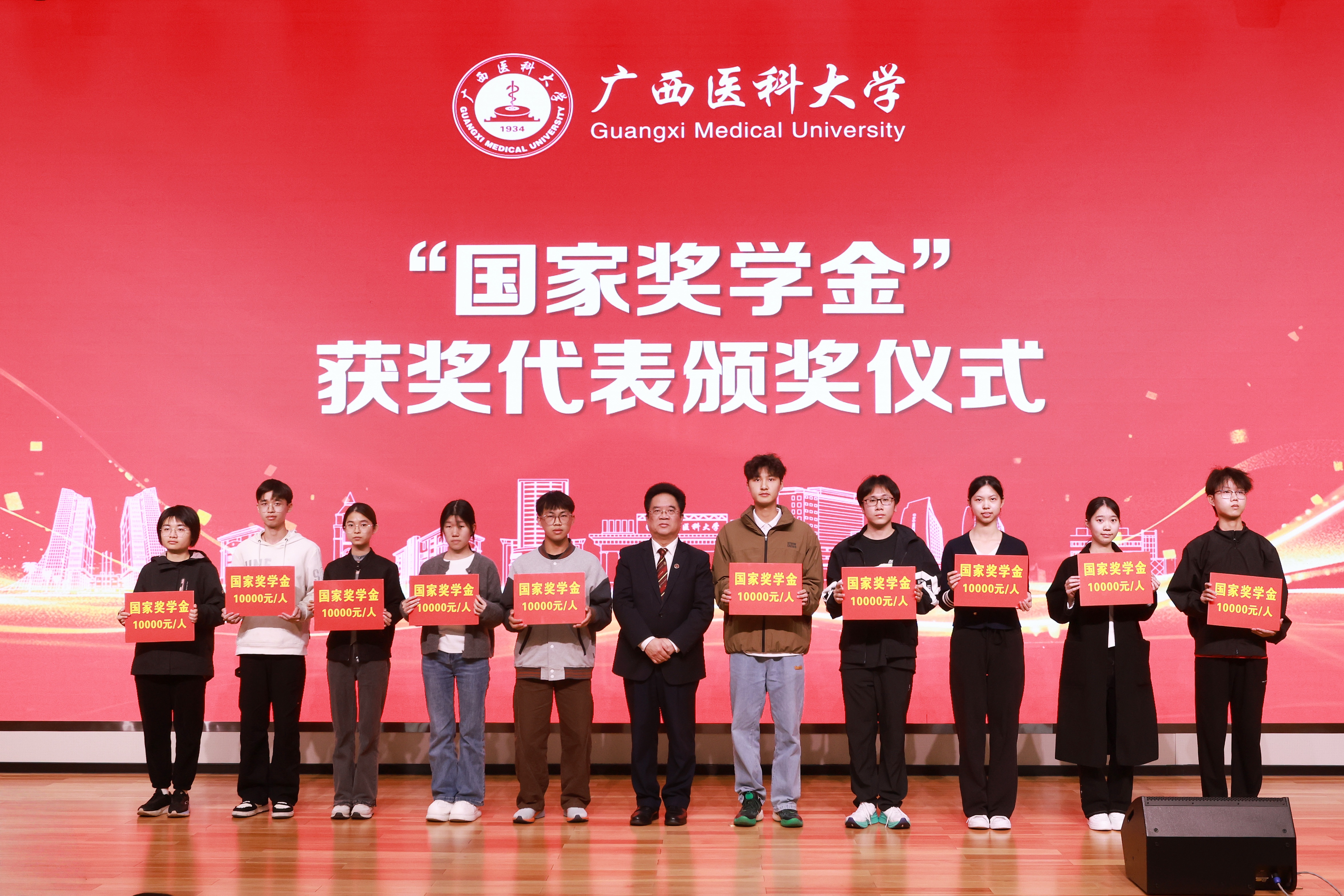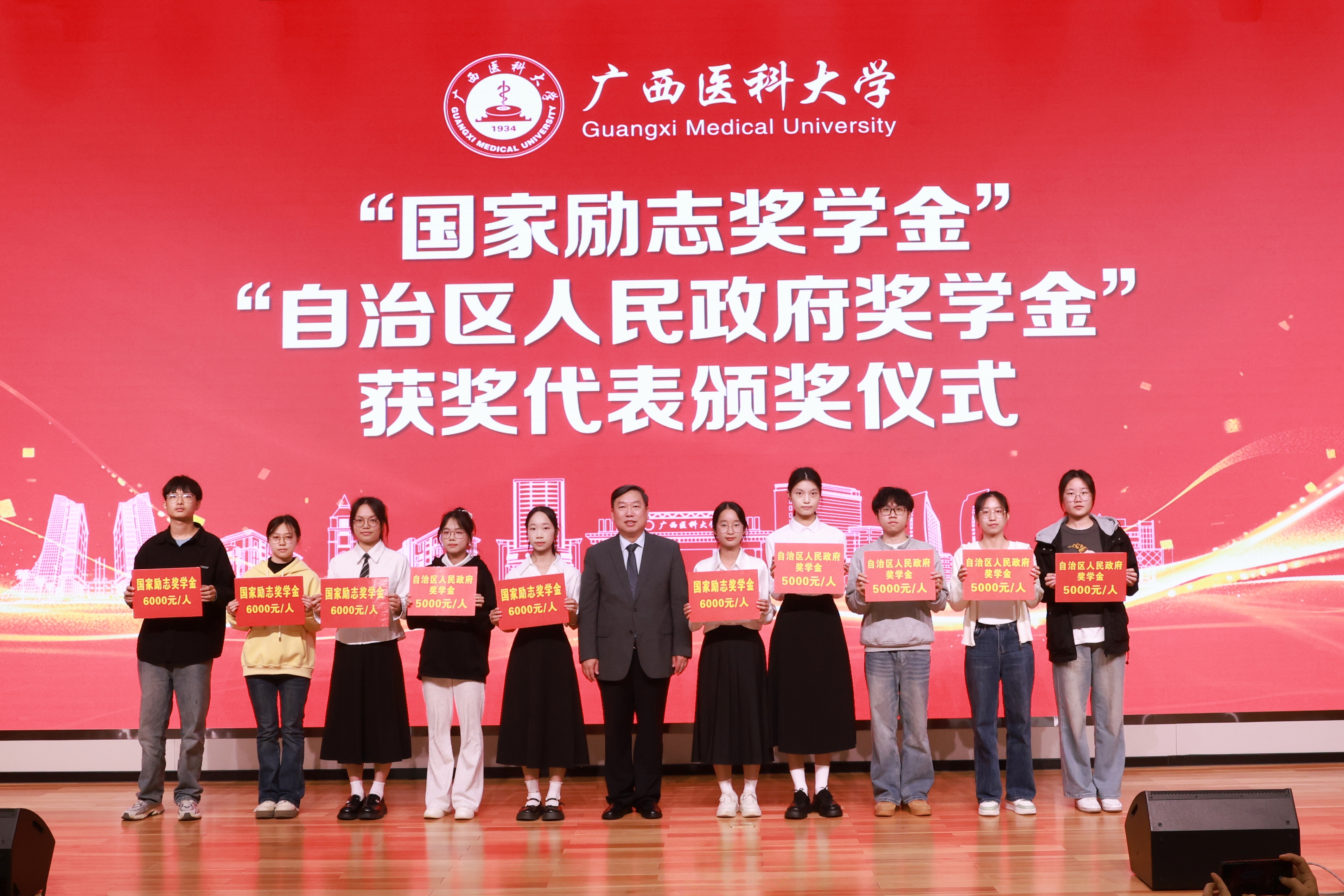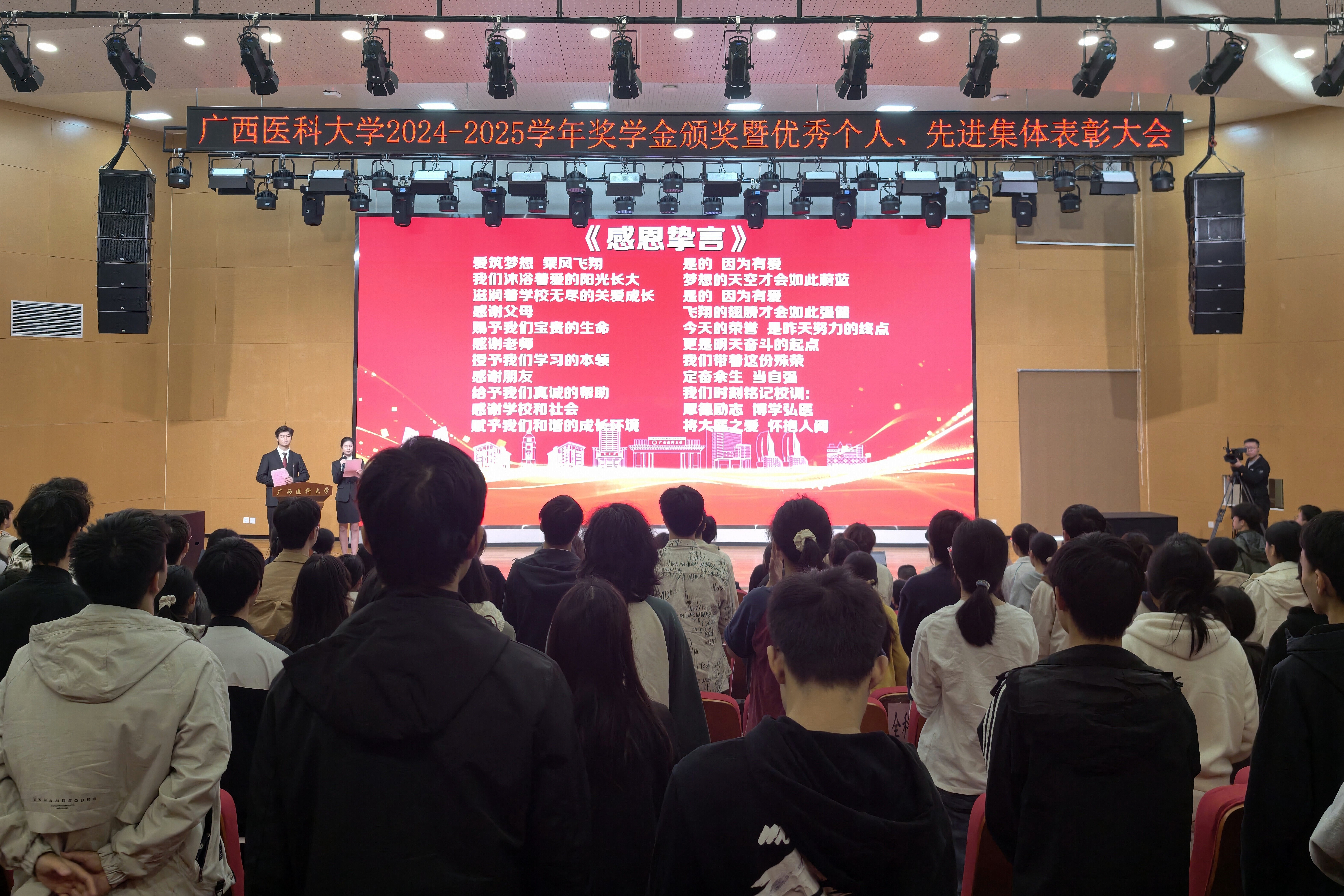 12月15日,广西医科大学2024-2025学年奖学金颁奖暨优秀个人、先进集体表彰大会在武鸣校区鼎新报告厅举行,曾志羽校长、陈俊强副校长、我校1959级校友李馥和、桂林优利特电子集团有限公司广西省区经理蒋爱华、我校玉林校友联络处秘书长钱冲、学校相关部处领导及各学院分管学生工作的领导、辅导员、班主任及学生代表400余人参加大会。本次大会采用线上同步实况直播的方式,校本部、武鸣校区及玉林校区场外师生实时观看大会。